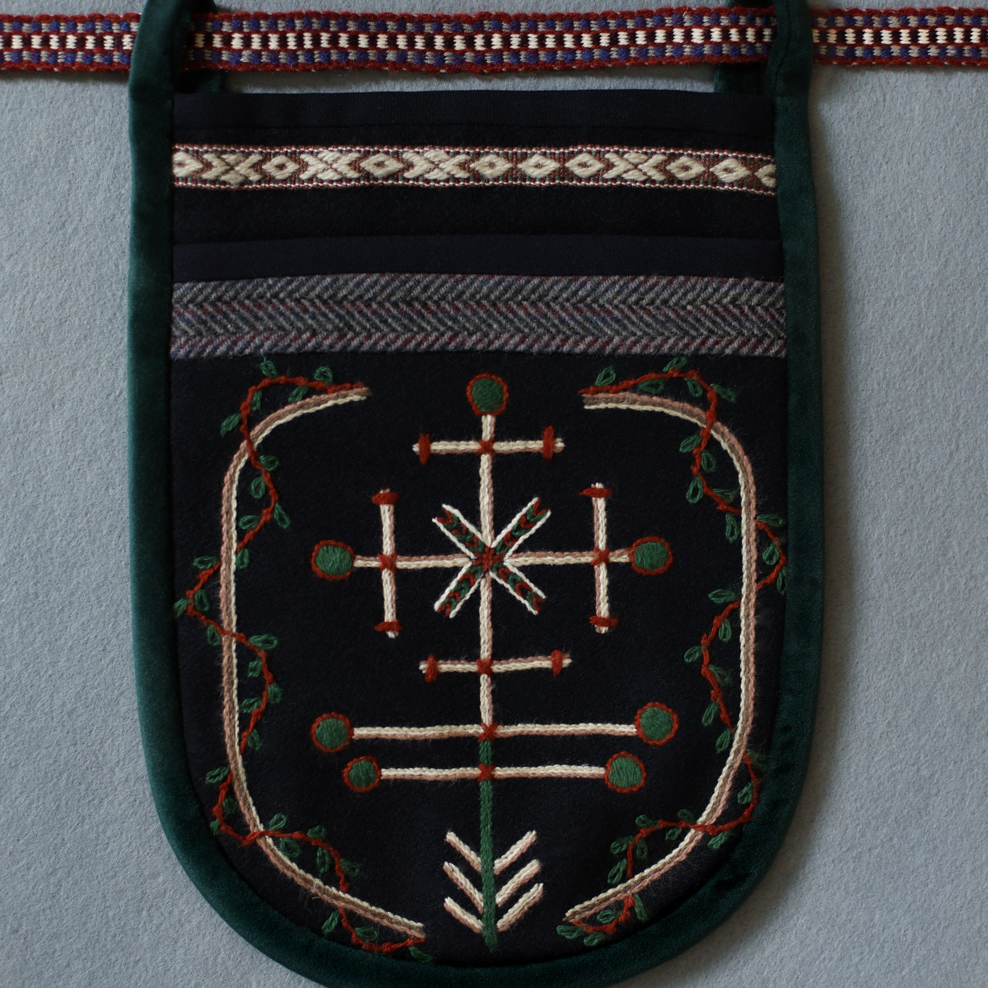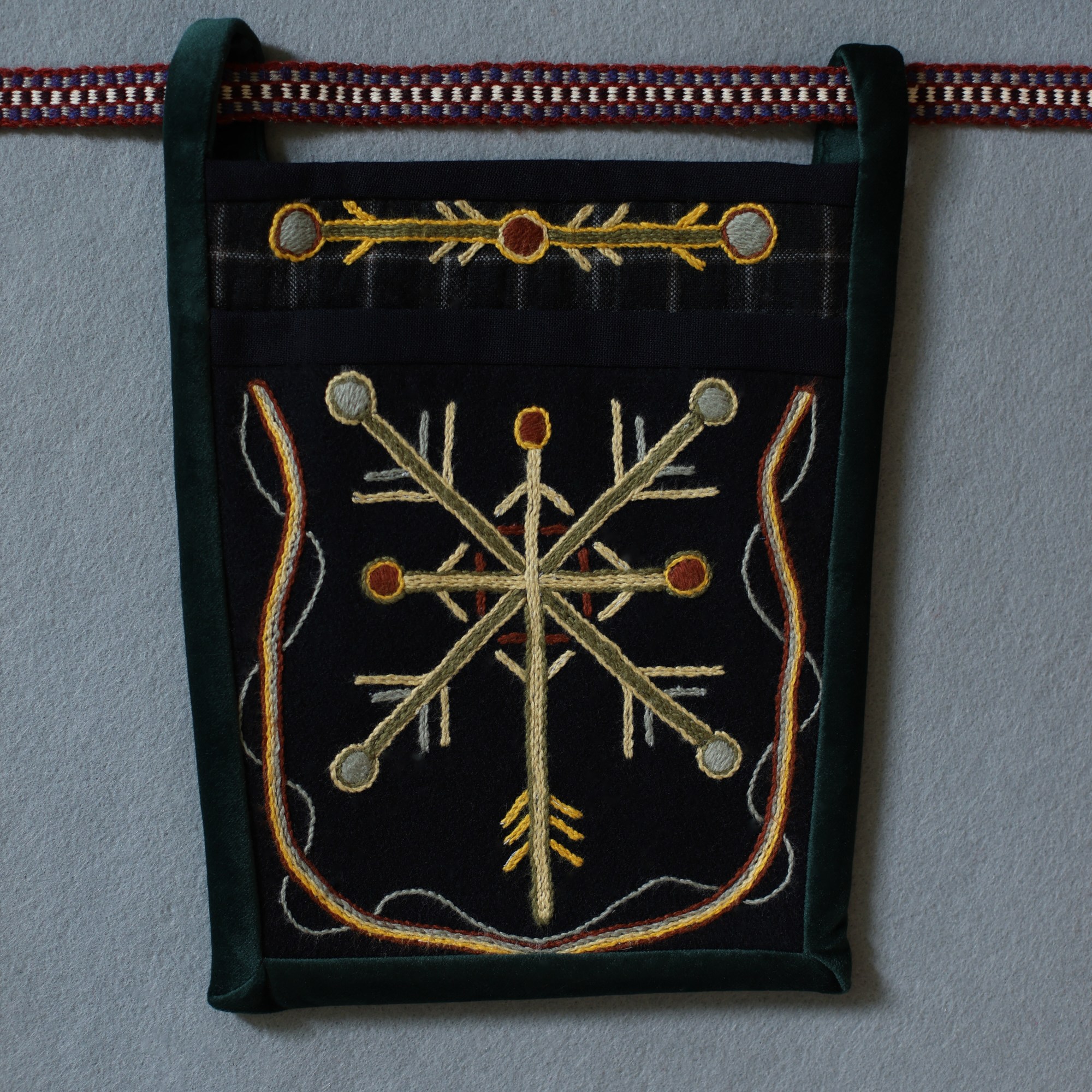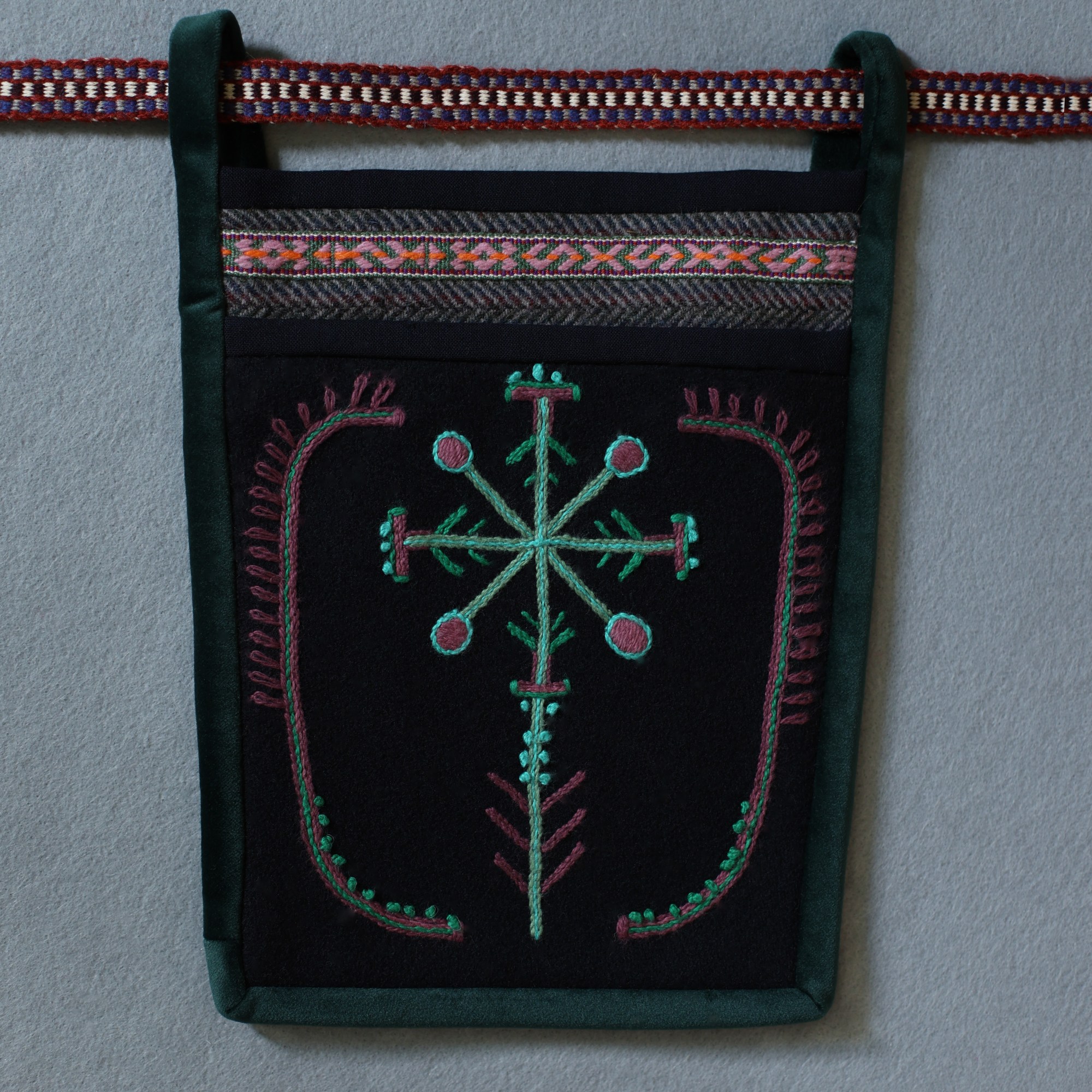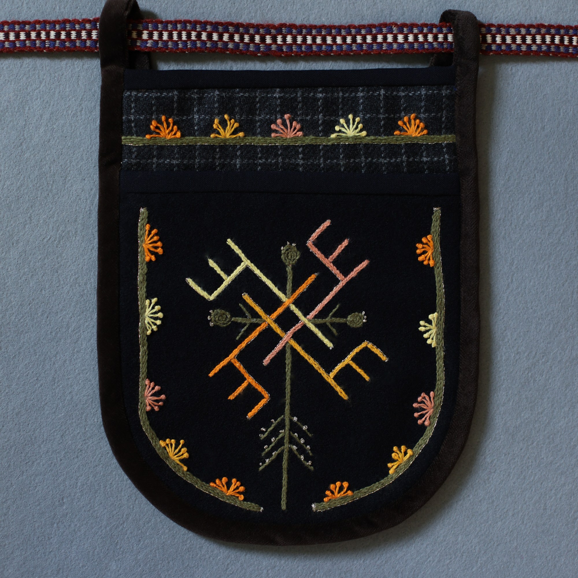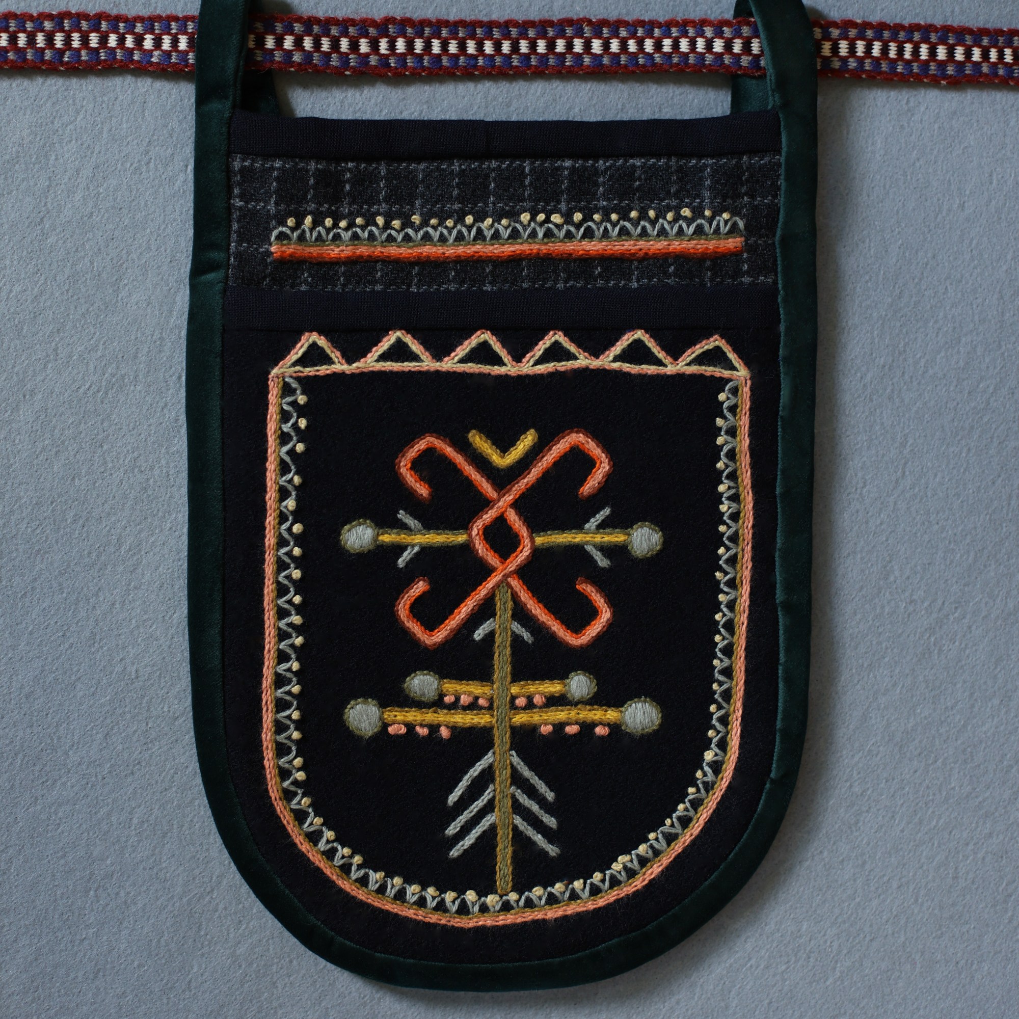 The most interesting part of the traditional feminine costume of Klaipėda (West Lithuania) region is a small embroidered bag, usually decorated with floral and geometric patterns. A delmon is used for carrying small items and money. In 17th-18th centuries delmons were worn on belts or fastened to the waist with a patterned band. Around the beginning of 20th century they were hidden by an apron.