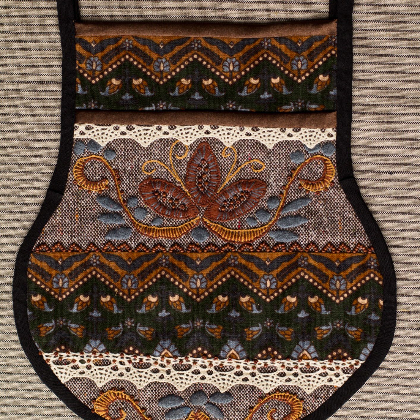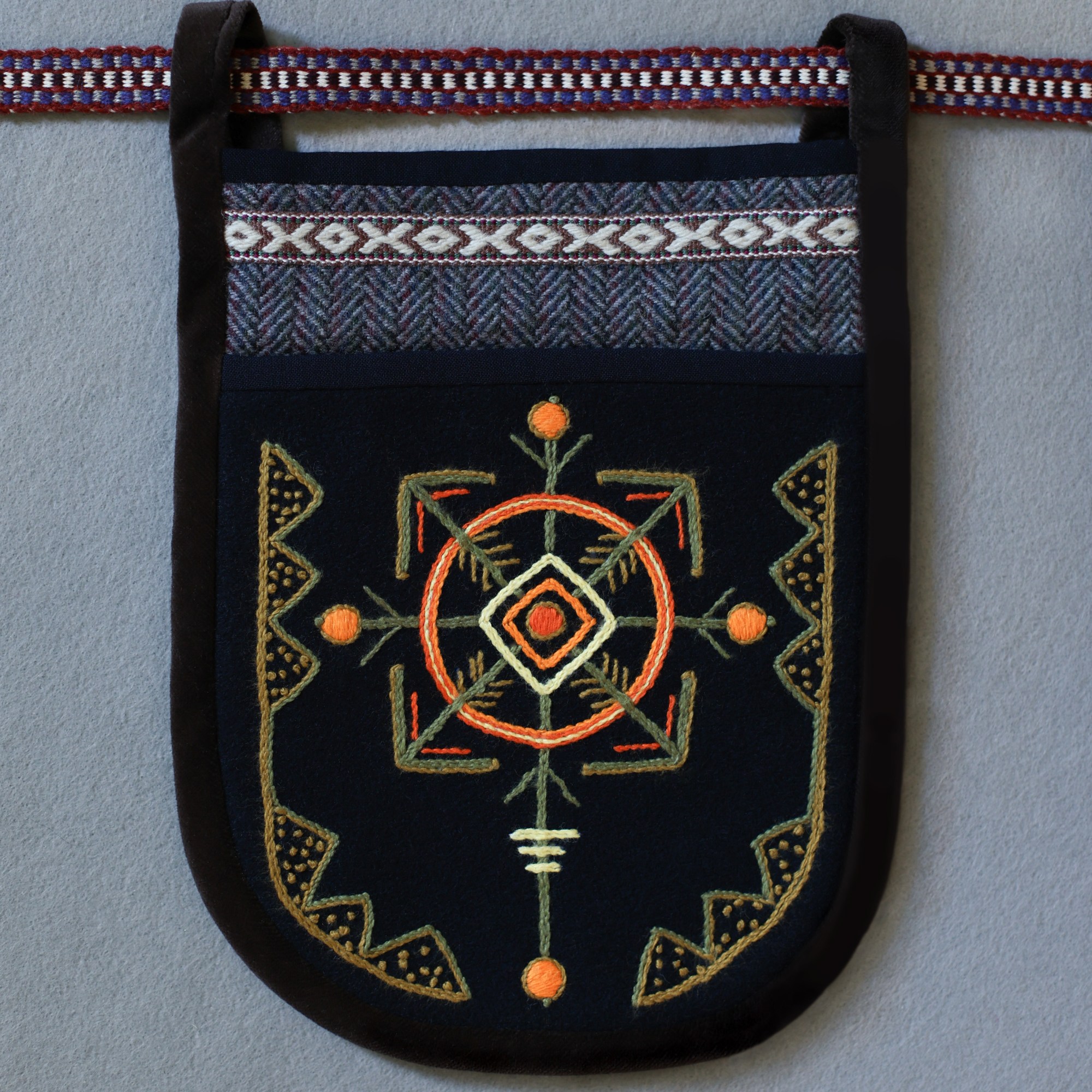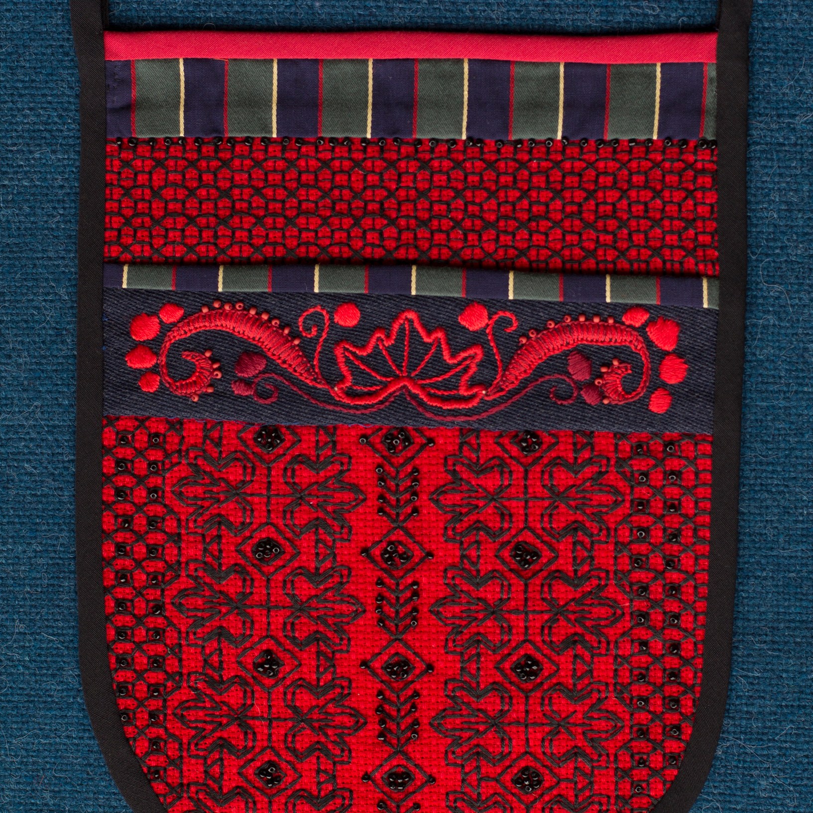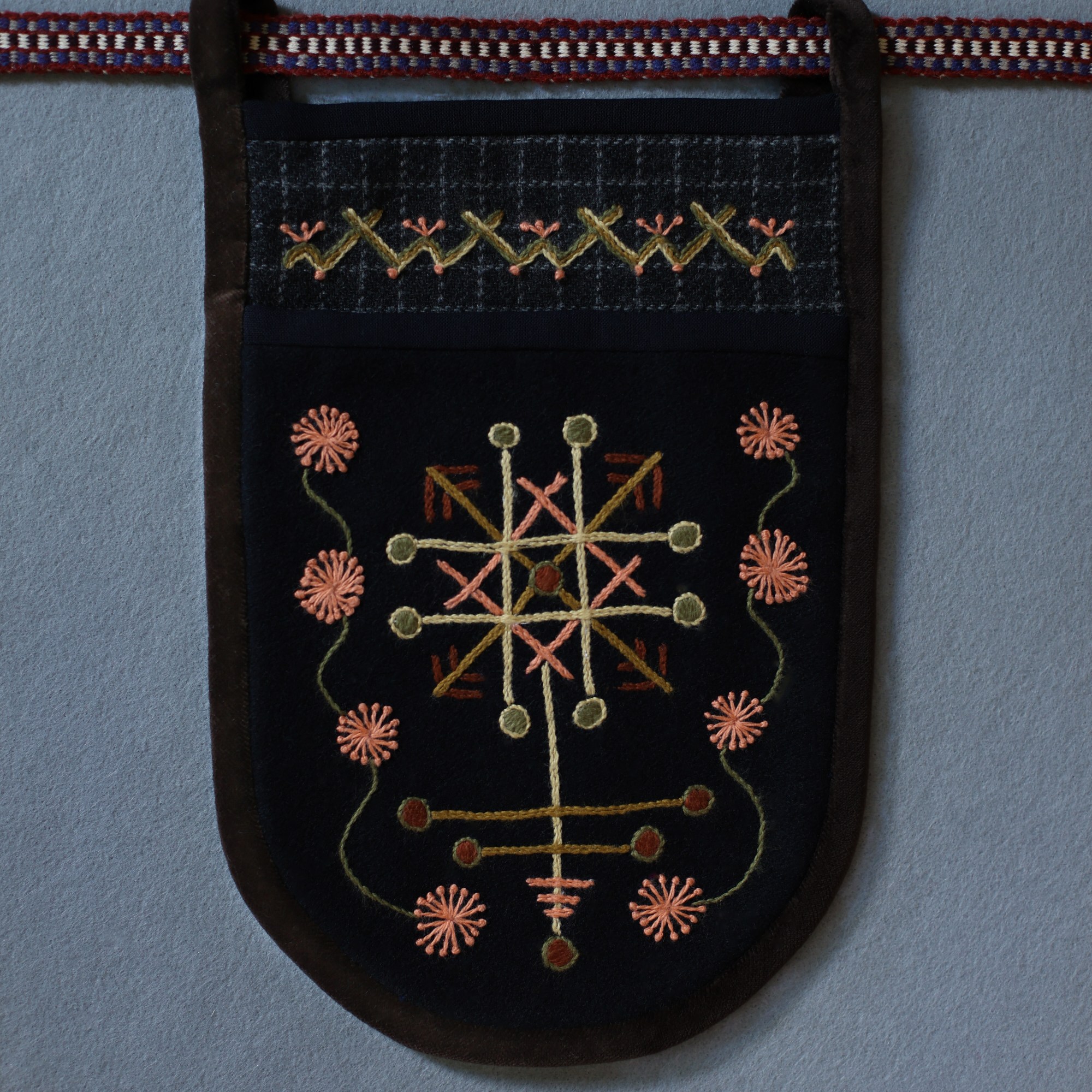 The most interesting part of the traditional feminine costume of Klaipėda (West Lithuania) region is a small embroidered bag, usually decorated with floral and geometric patterns. A delmon is used for carrying small items and money. In 17th-18th centuries delmons were worn on belts or fastened to the waist with a patterned band. Around the beginning of 20th century they were hidden by an apron.