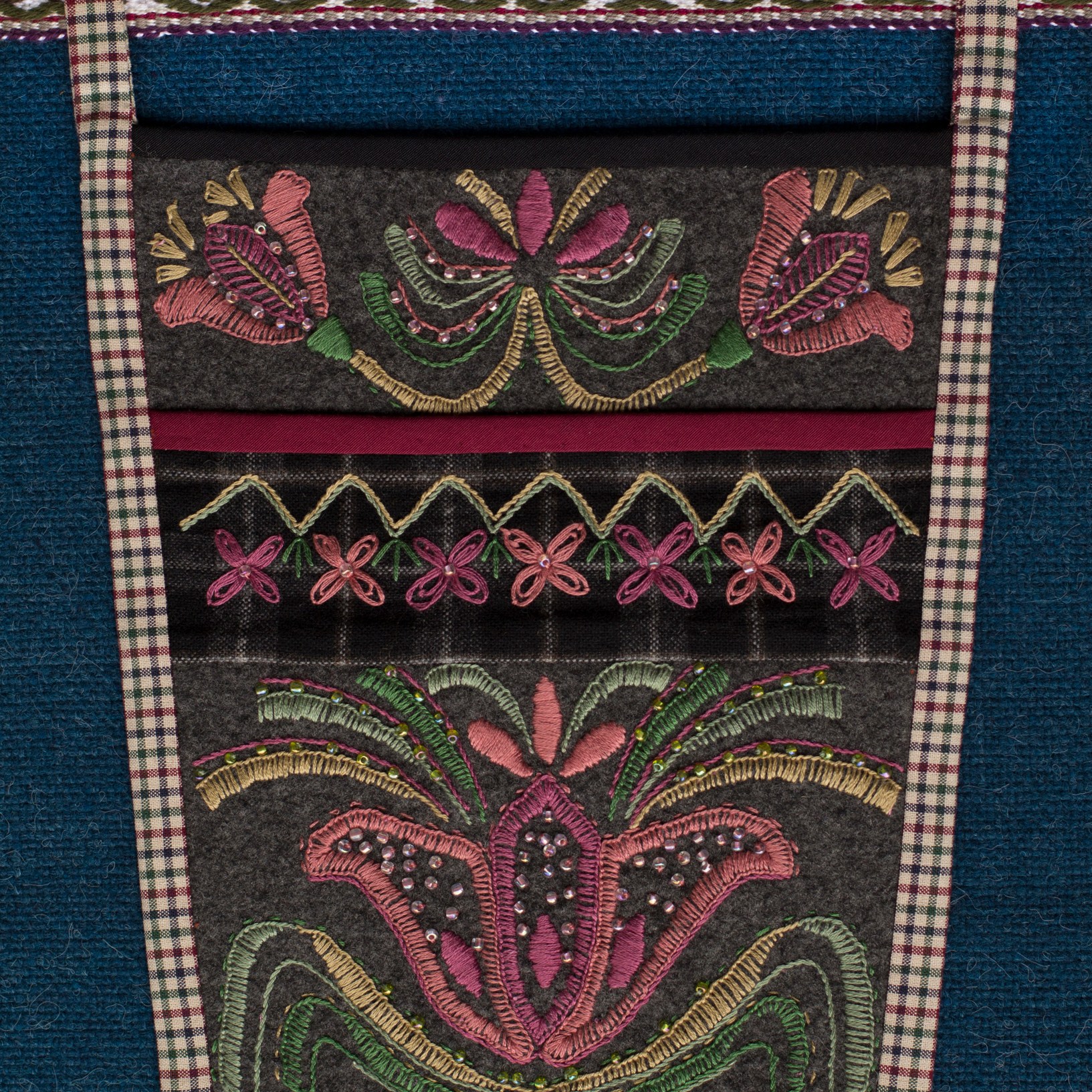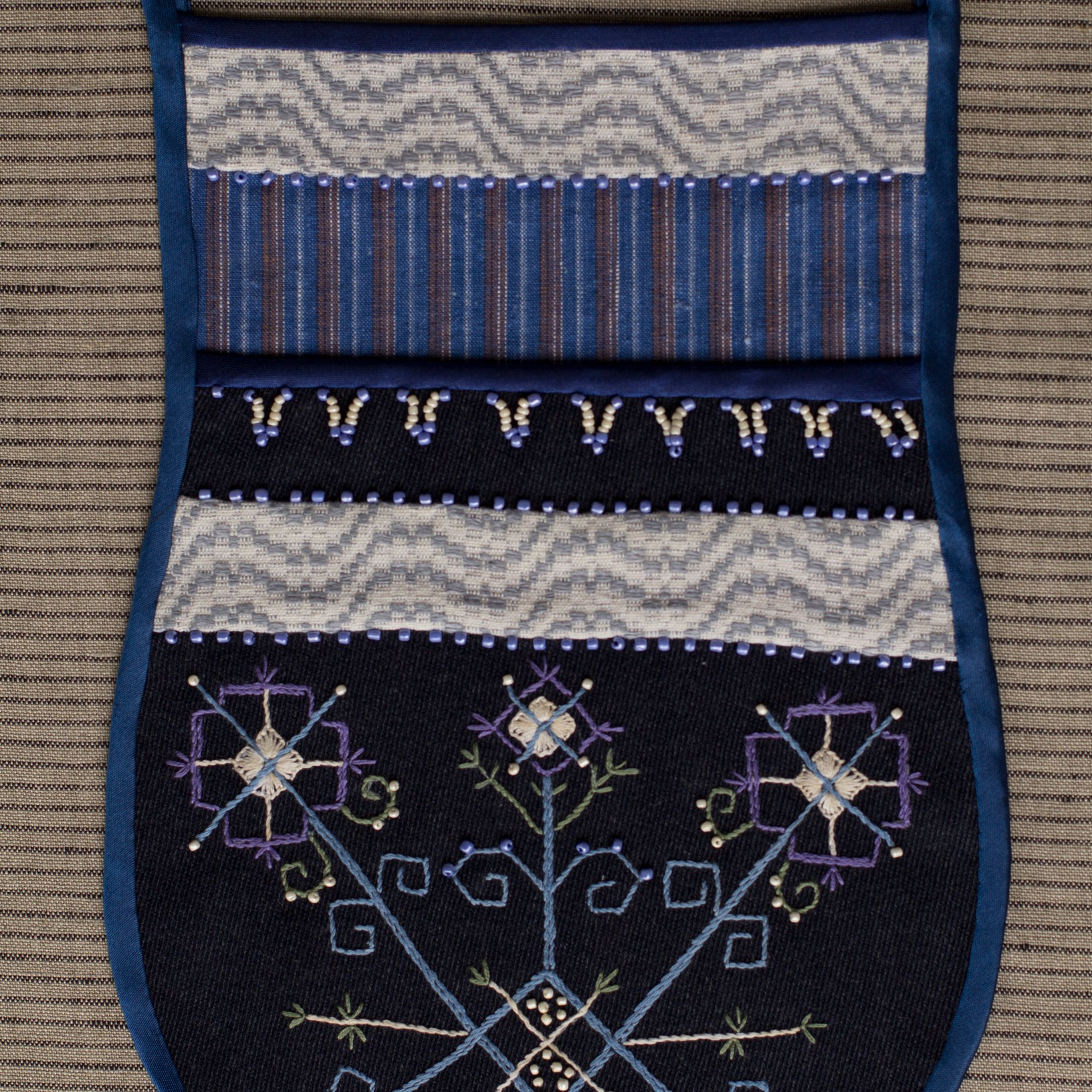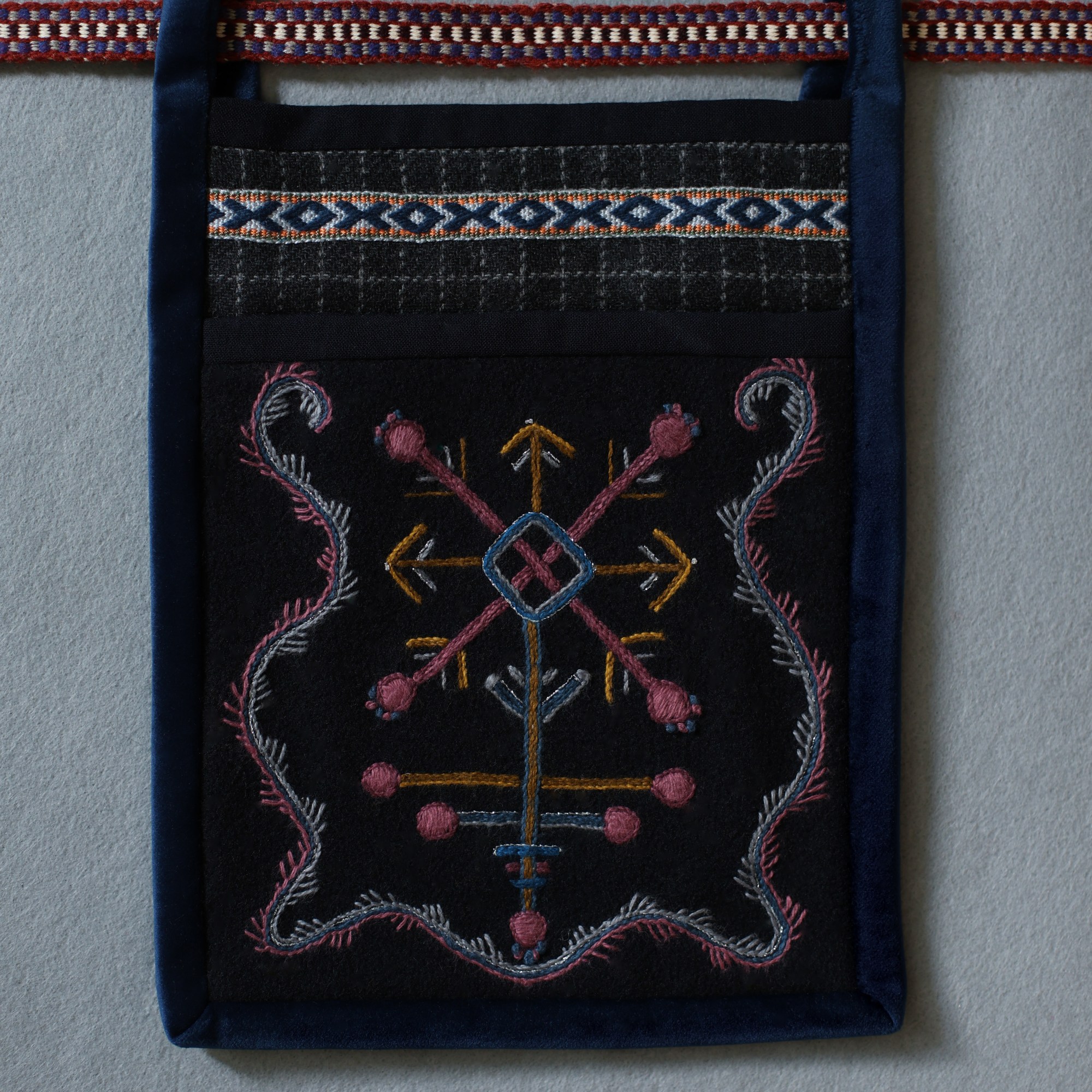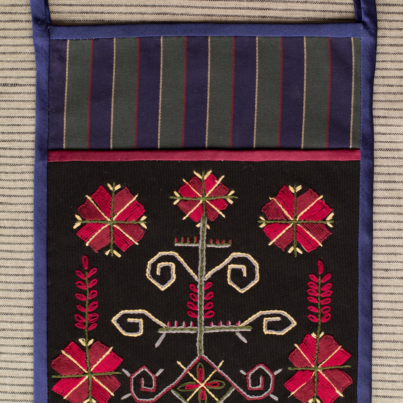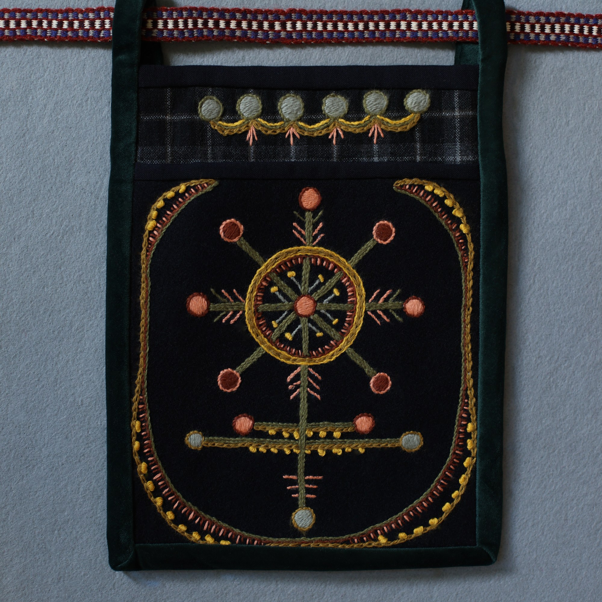 The most interesting part of the traditional feminine costume of Klaipėda (West Lithuania) region is a small embroidered bag, usually decorated with floral and geometric patterns. A delmon is used for carrying small items and money. In 17th-18th centuries delmons were worn on belts or fastened to the waist with a patterned band. Around the beginning of 20th century they were hidden by an apron.