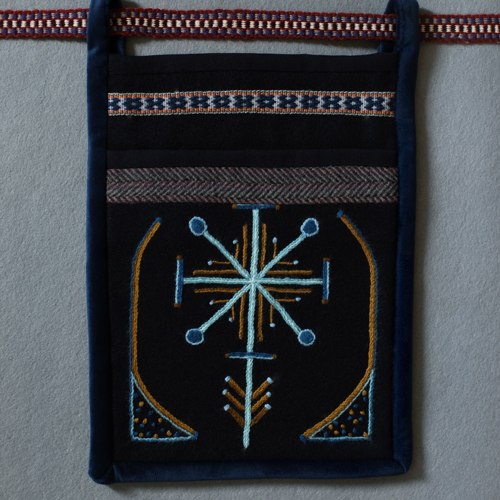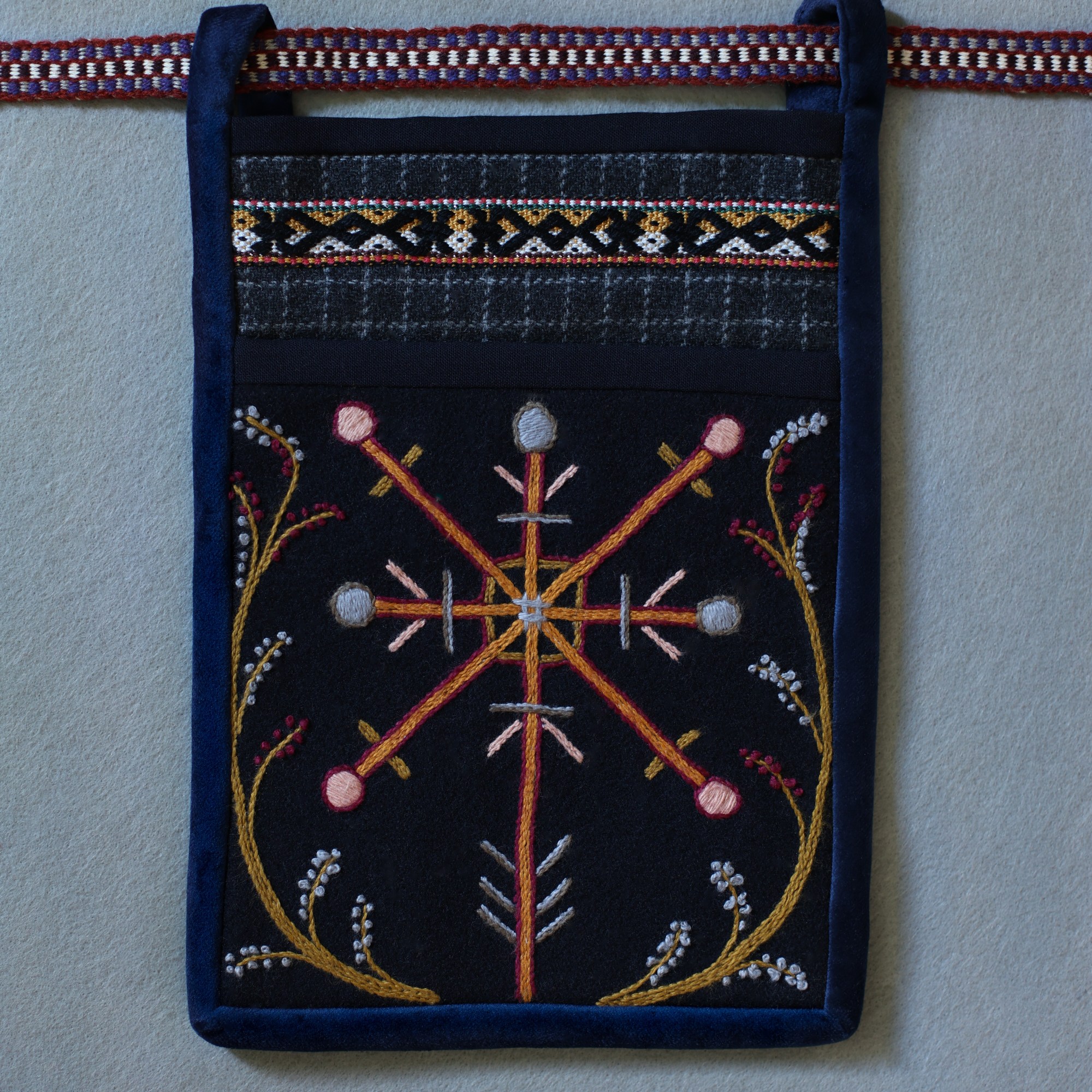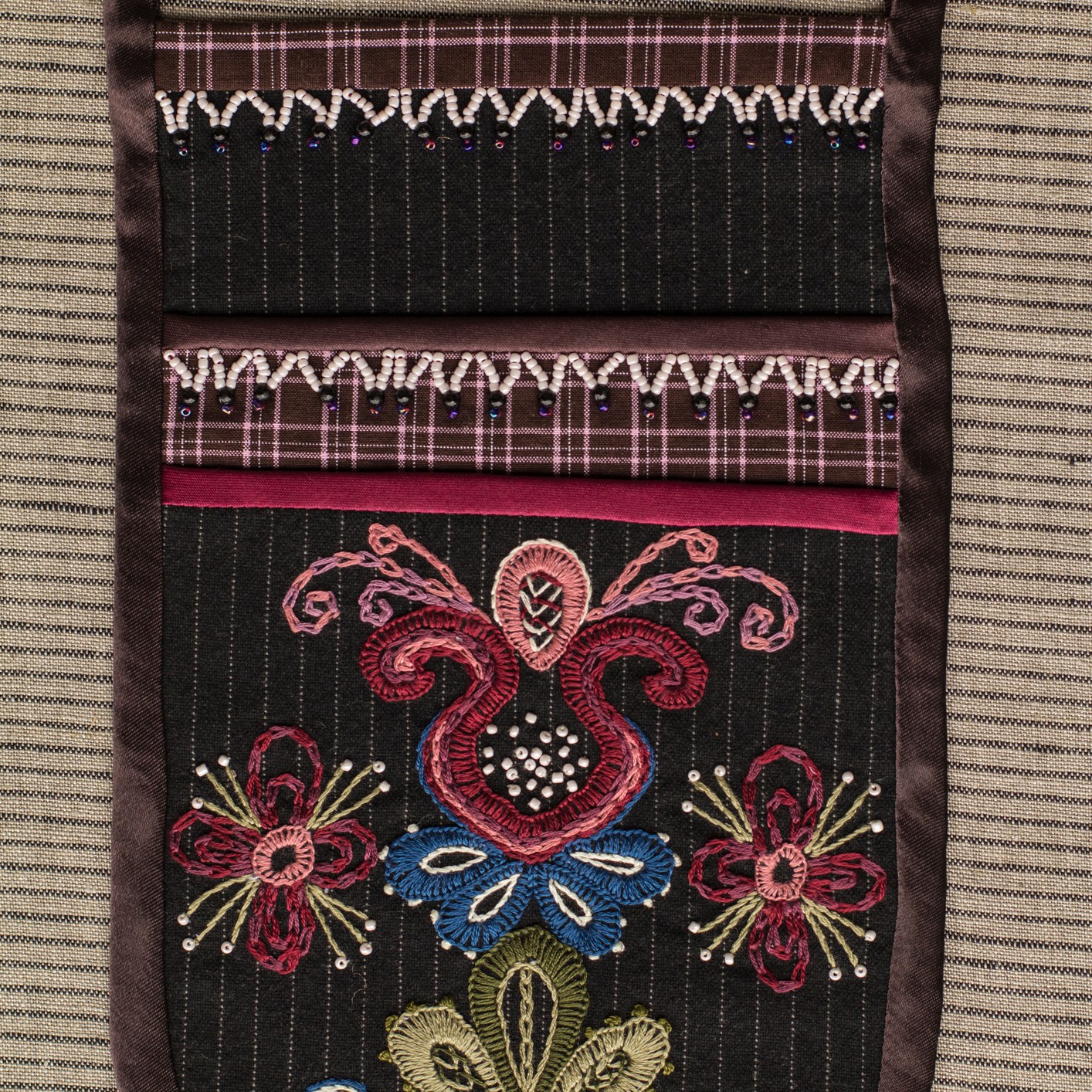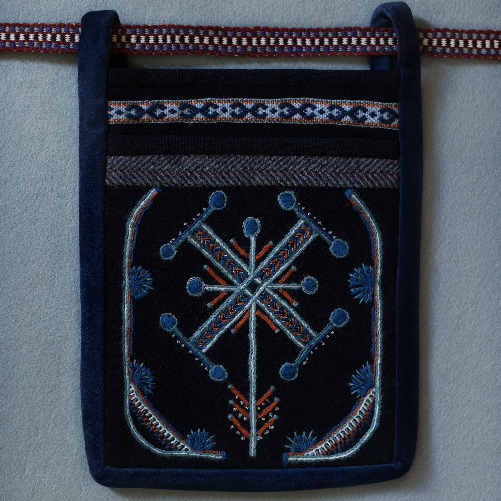 The most interesting part of the traditional feminine costume of Klaipėda (West Lithuania) region is a small embroidered bag, usually decorated with floral and geometric patterns. A delmon is used for carrying small items and money. In 17th-18th centuries delmons were worn on belts or fastened to the waist with a patterned band. Around the beginning of 20th century they were hidden by an apron.