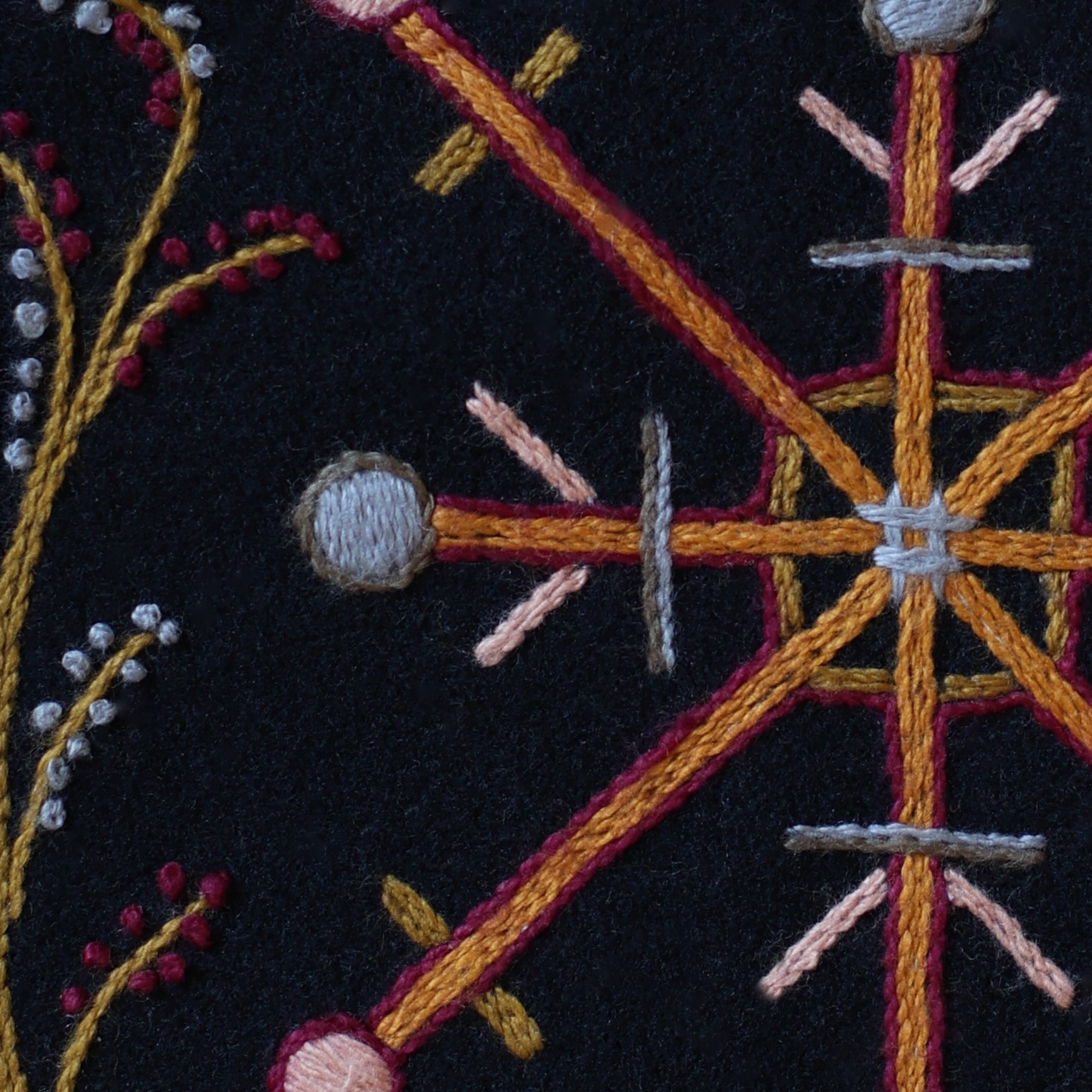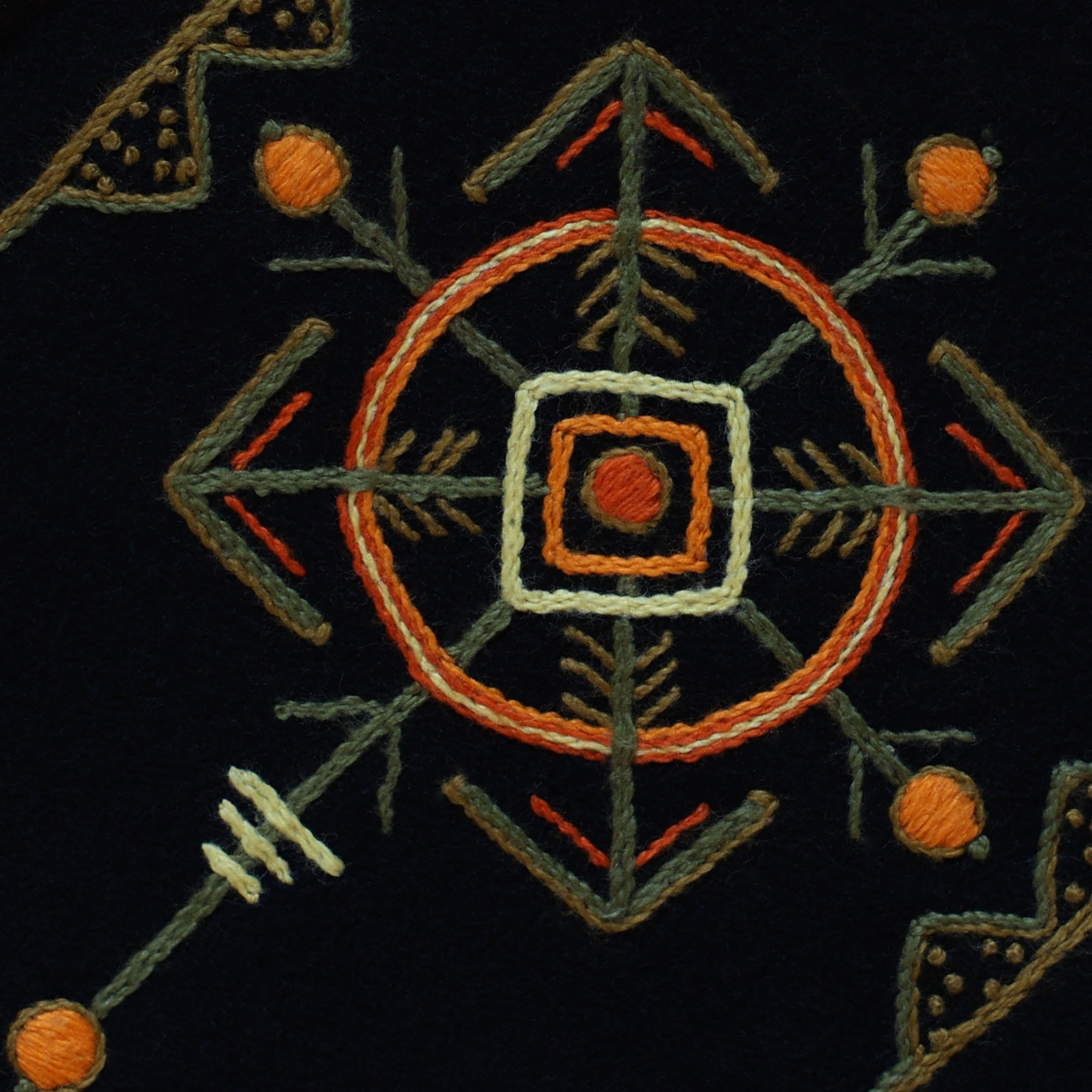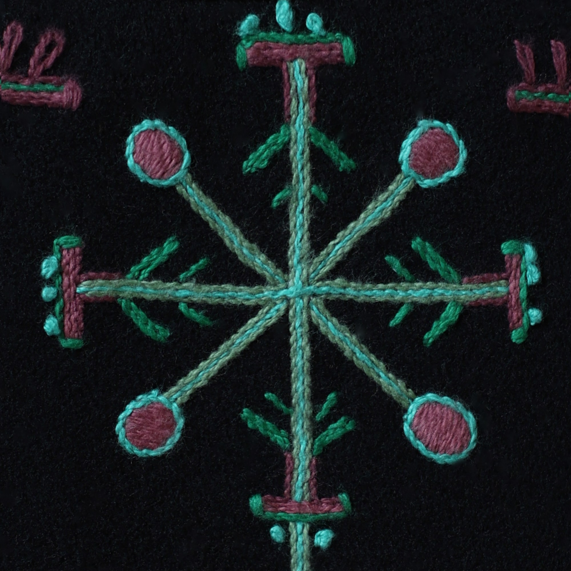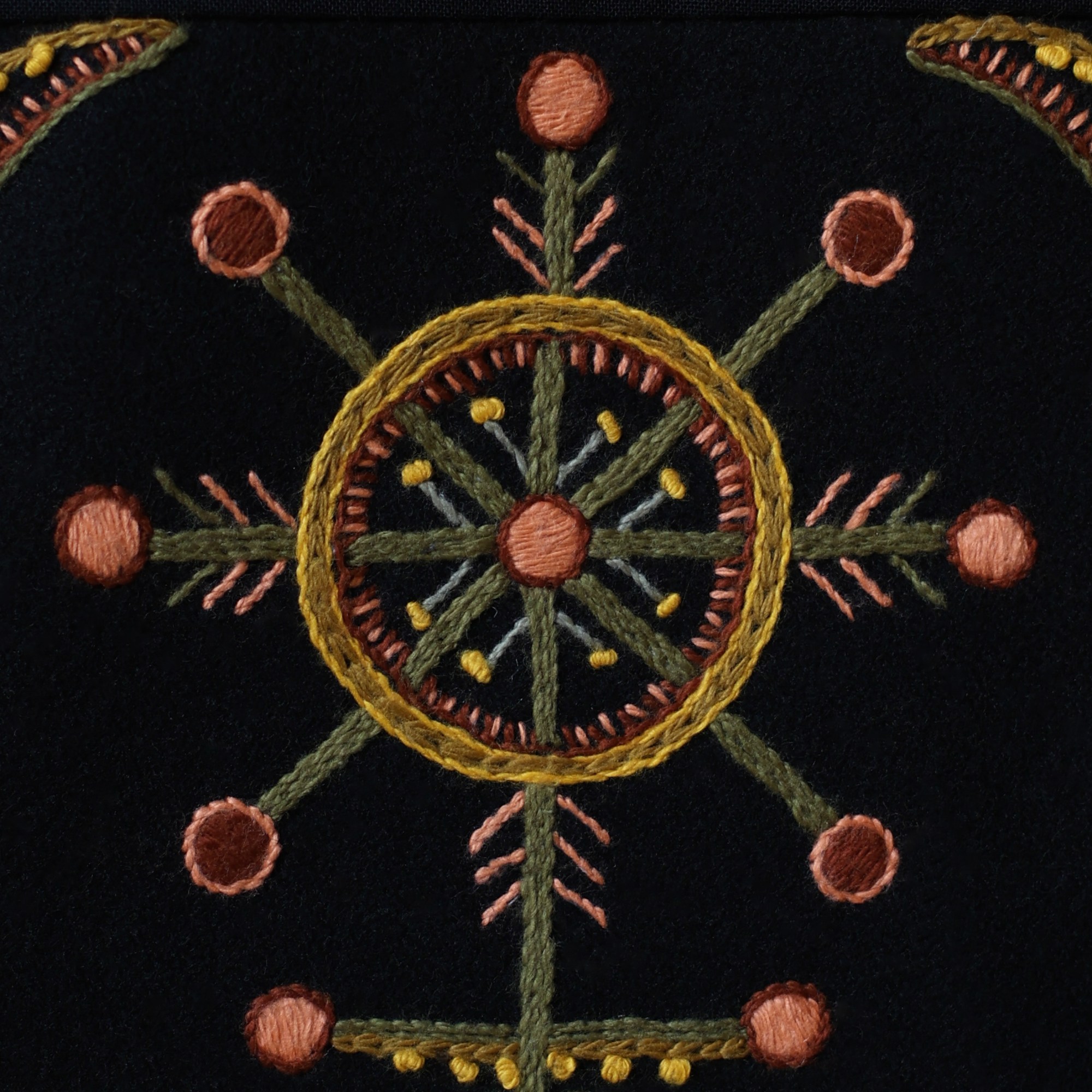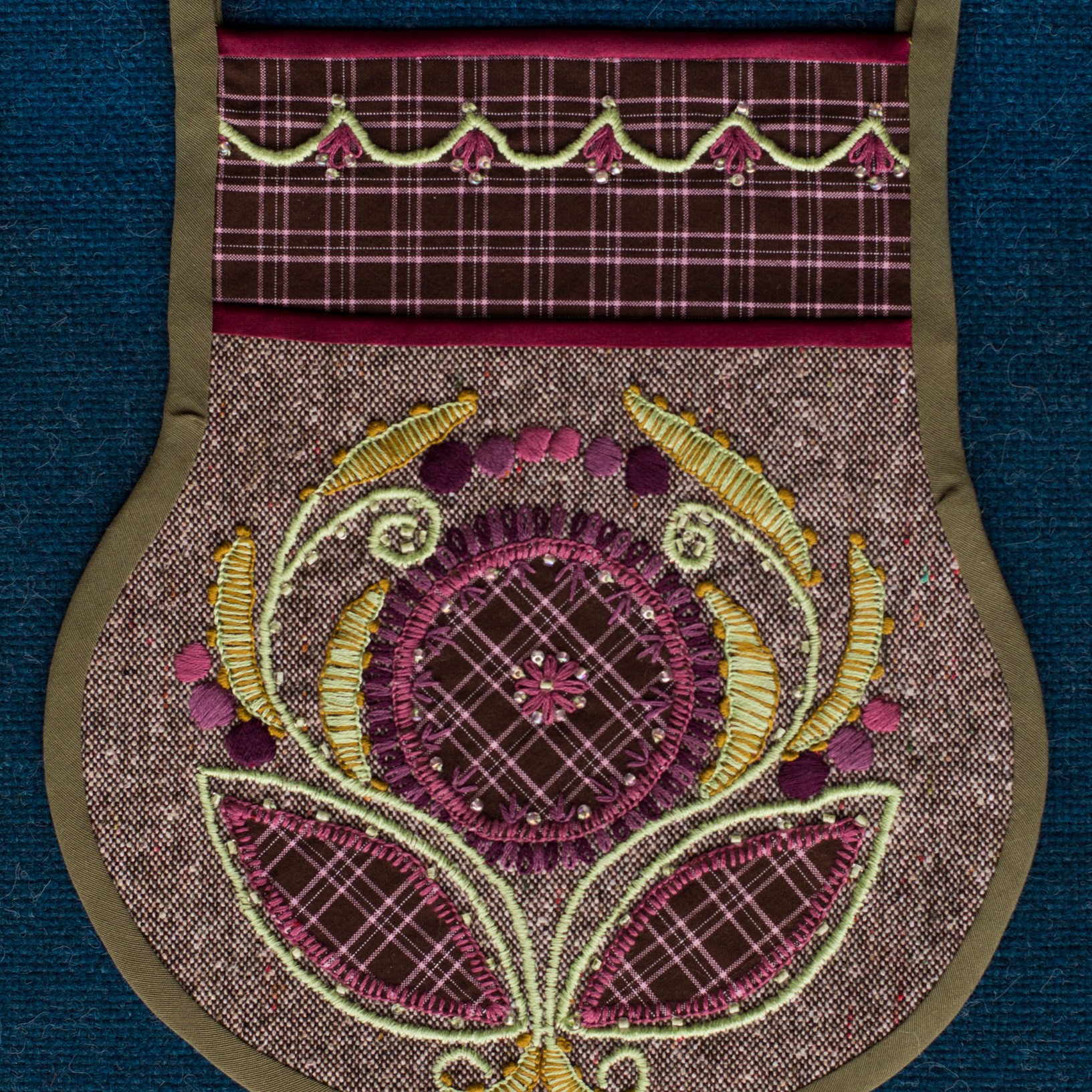 The most interesting part of the traditional feminine costume of Klaipėda (West Lithuania) region is a small embroidered bag, usually decorated with floral and geometric patterns. A delmon is used for carrying small items and money. In 17th-18th centuries delmons were worn on belts or fastened to the waist with a patterned band. Around the beginning of 20th century they were hidden by an apron.